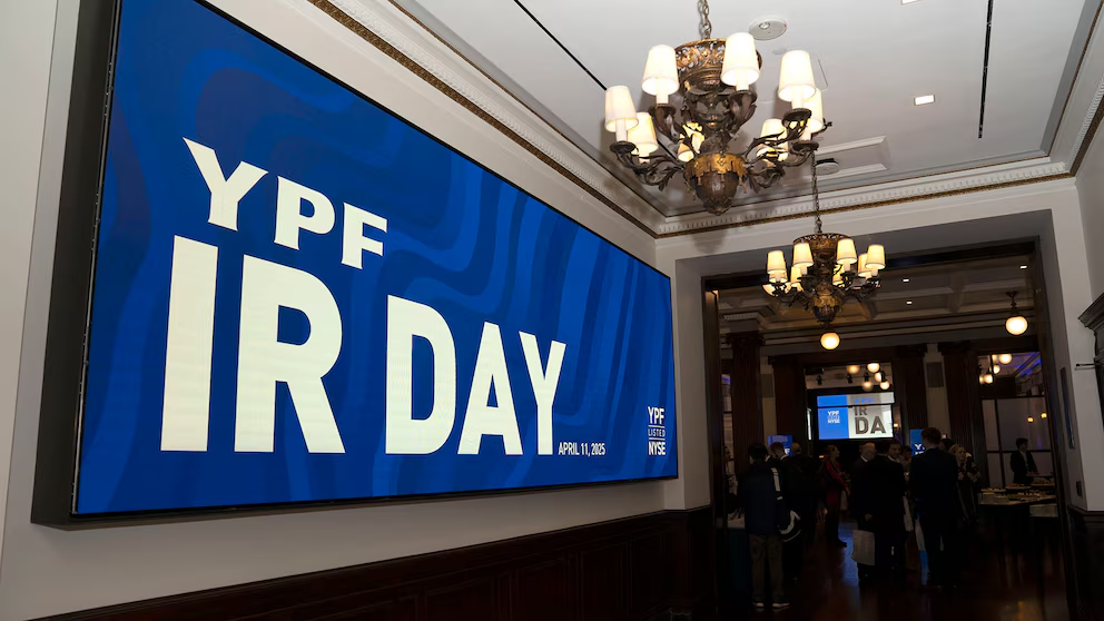 El evento se realizó en Freedon Hall del piso 7 del New York Stock Exchange, en el corazón de los mercados globales que pasan del rojo al verde, y viceversa, al ritmo de las noticias. El edificio del NYSE cubrió su fachada con un cartel de YPF, banderas de la empresa y la frase “Delivering the full potencial of Vaca Muerta Argentina”. “Montaña rusa” fue un término usado por los presentes en el evento para definir el contexto. La incertidumbre es fuerte y se siente también en las calles de la Gran Manzana.