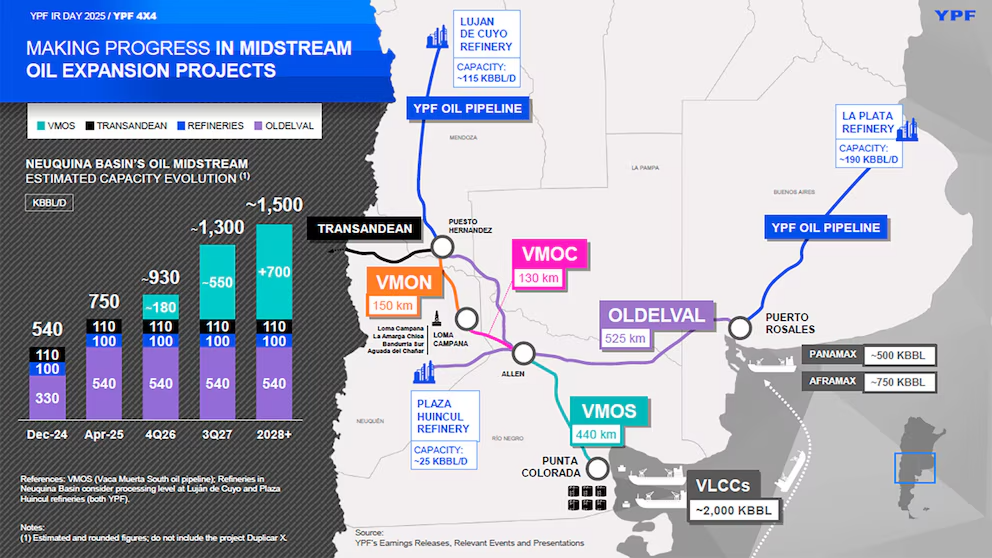 Destacó las inversiones para evacuar el petróleo de Vaca Muerta, con VMOS, el oleoducto que construye junto a las principales compañías del mercado local y estará listo a fines de 2026. En 2024, la empresa produjo 257 KBBL, o miles de barriles de crudo equivalentes por día, con un 48% que ya viene del shale; y 37,4 millones de metros cúbicos de gas, con un 55% de shale.